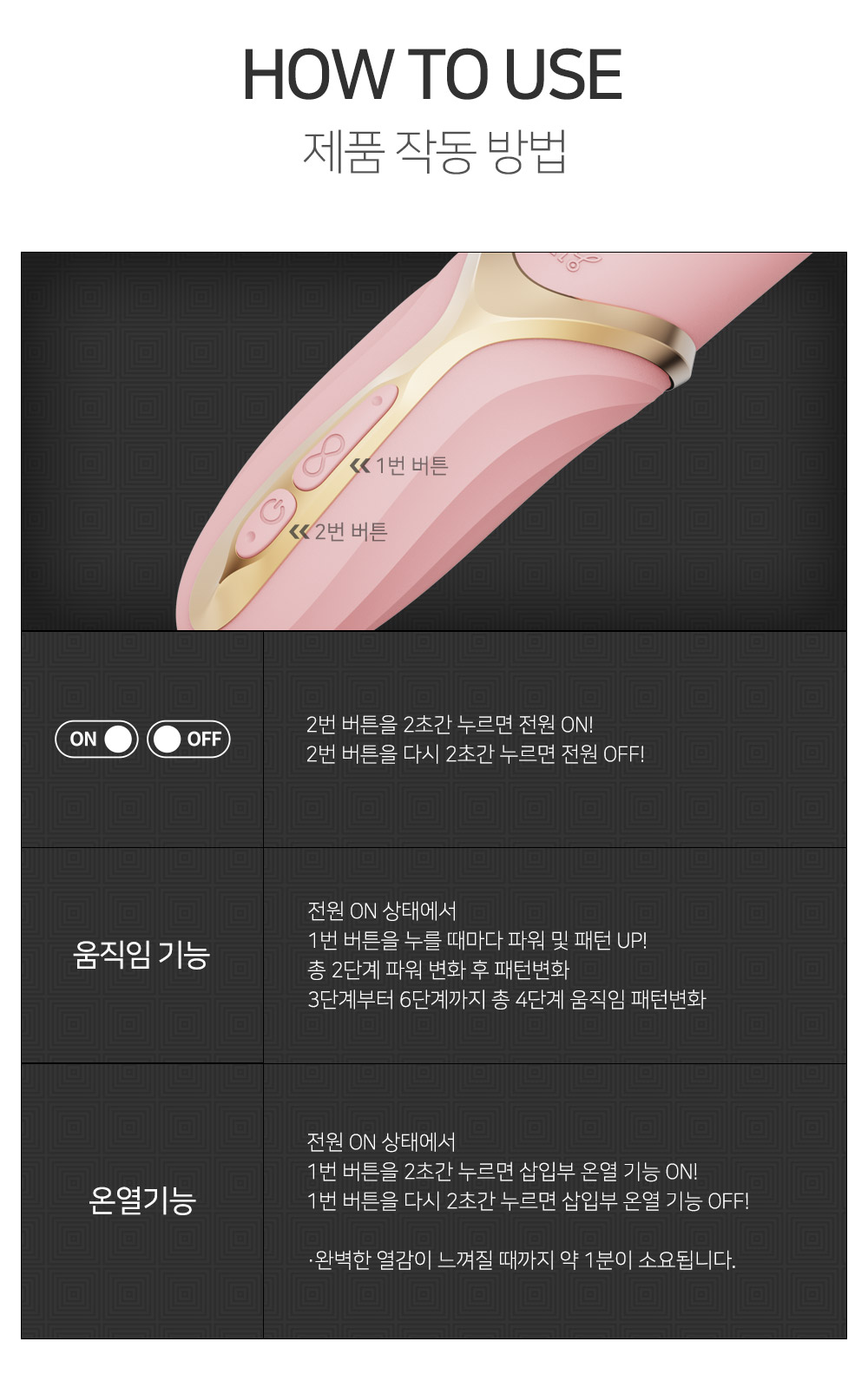 디자인이 예쁘고 온열모드, 진동 등 다양한 기능이 있어 좋습니다. 초보자가 쓰기에는 좀 두껍고, 3~6단계는 움직임이 너무 강해서 사용하기 어렵네요.